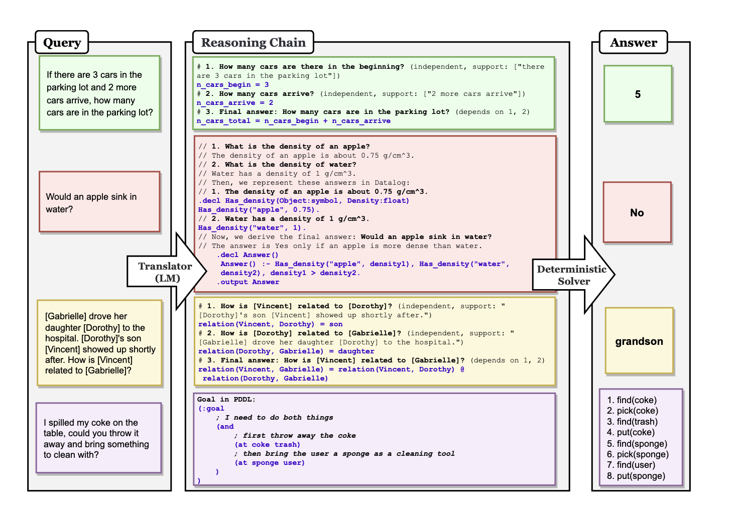 1. Translation : We first translate a user query into a series of reasoning steps. These are a task specific set of steps that we can execute deterministically.